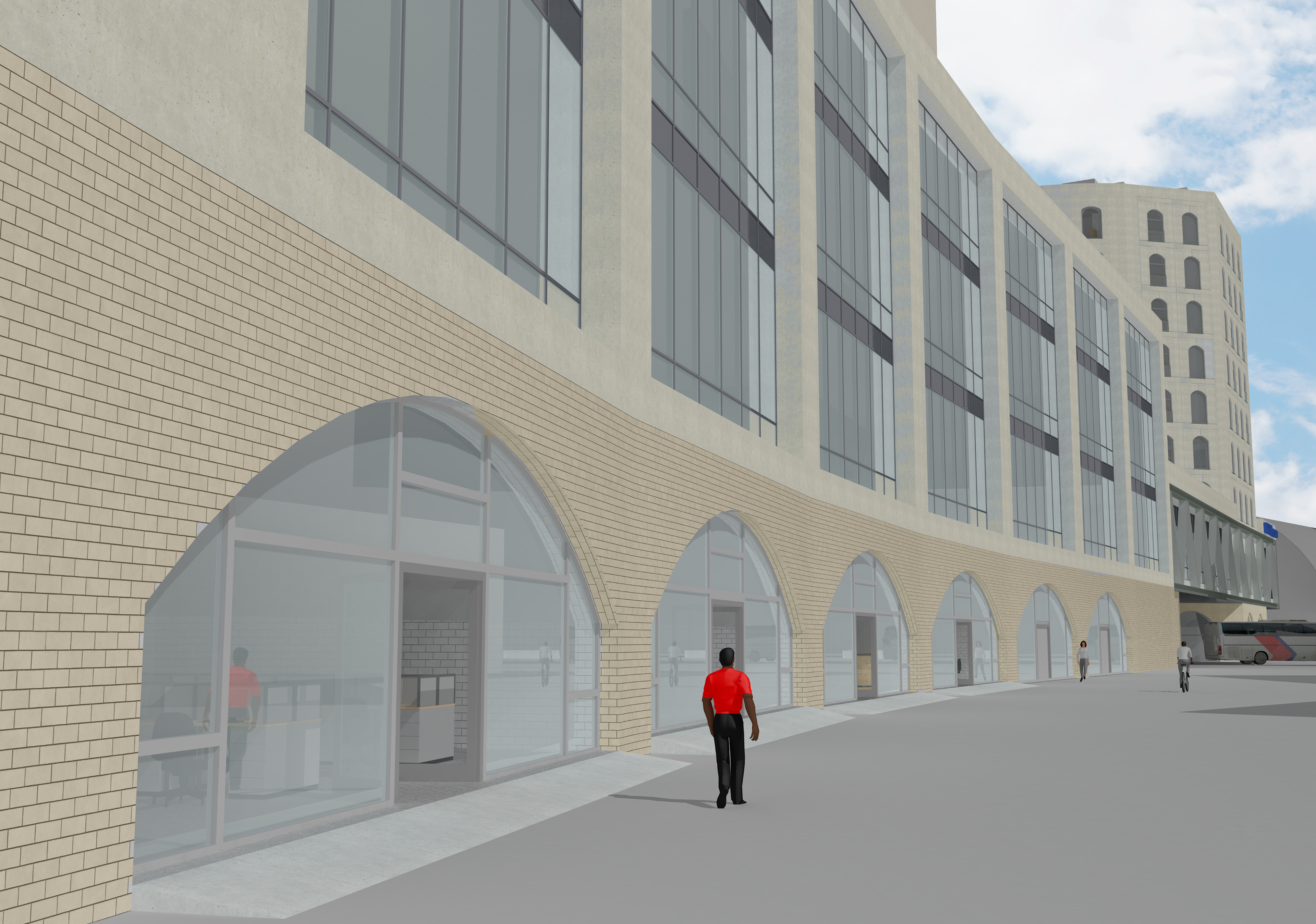 Der Entwurf nutzt die vorhandene Struktur des Stadtbahnviadukts und integriert diese in das Gesamtkonzept. Nur an drei Stellen werden die Gewölbe durch Treppenhauskerne punktuell geöffnet.