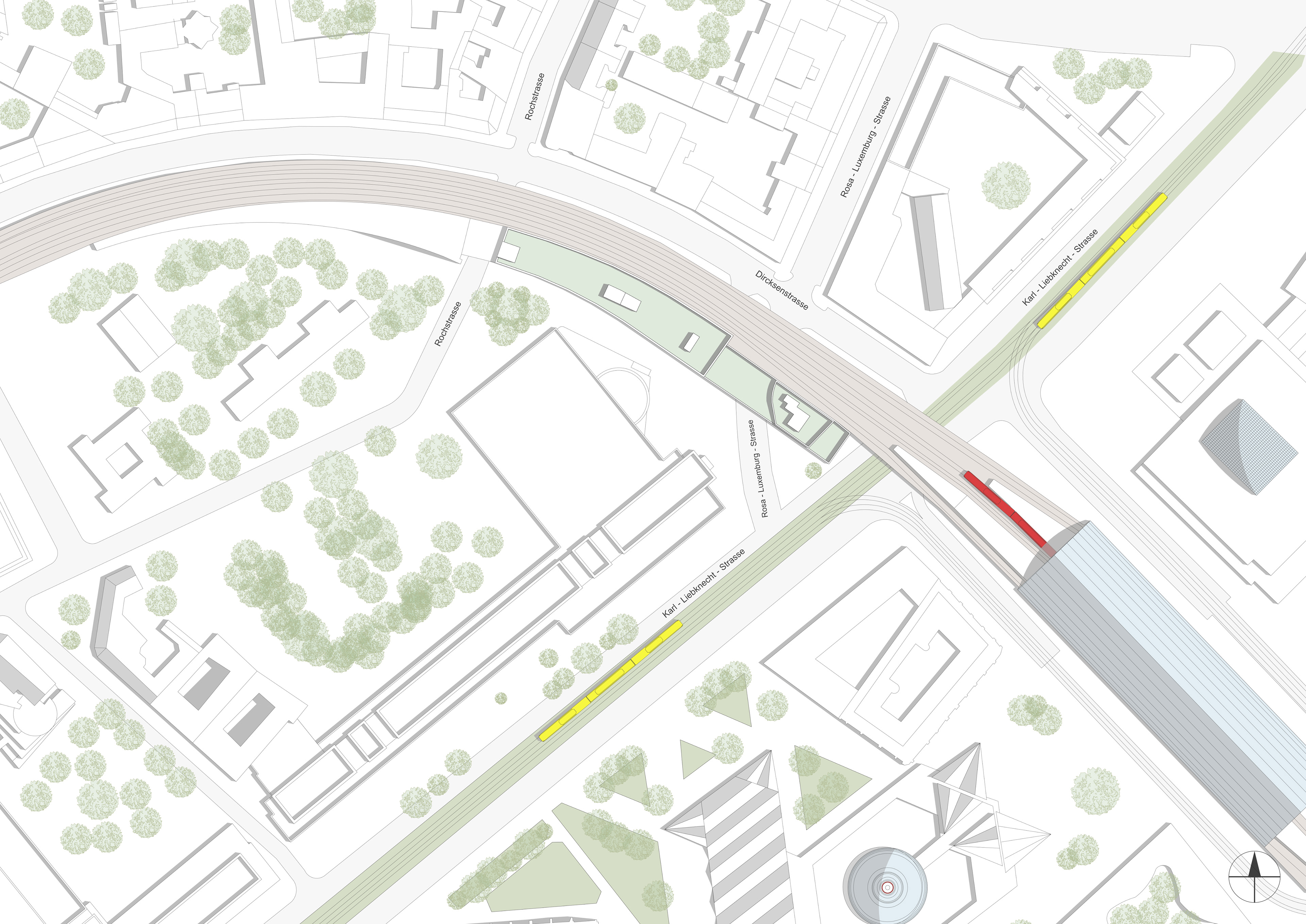 Der bestehende Imbiss an der Karl-Liebknecht-Straße wird rückgebaut. An seiner Stelle entsteht ein neuer Hochhausturm mit einer Gesamthöhe von 42 Metern.