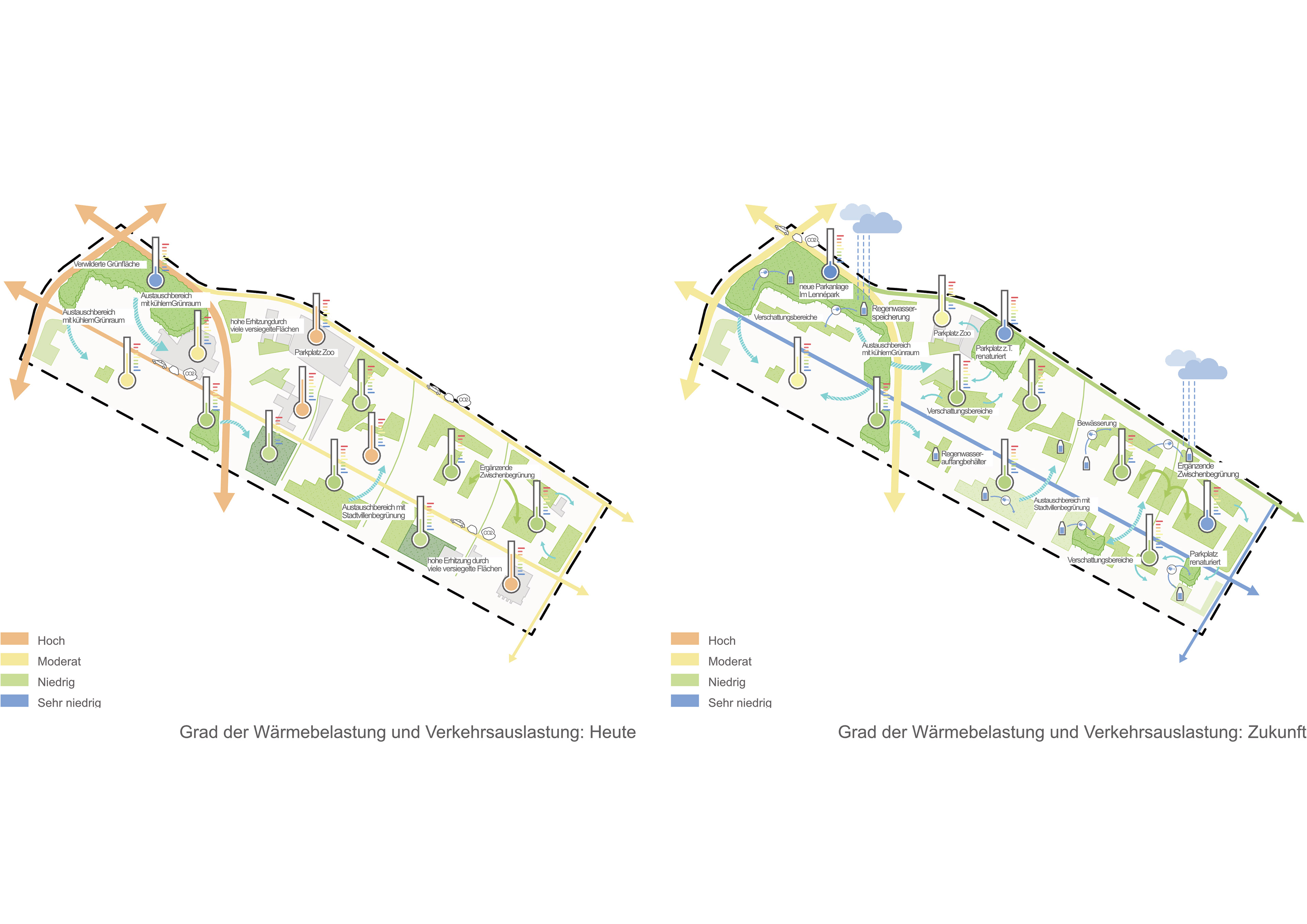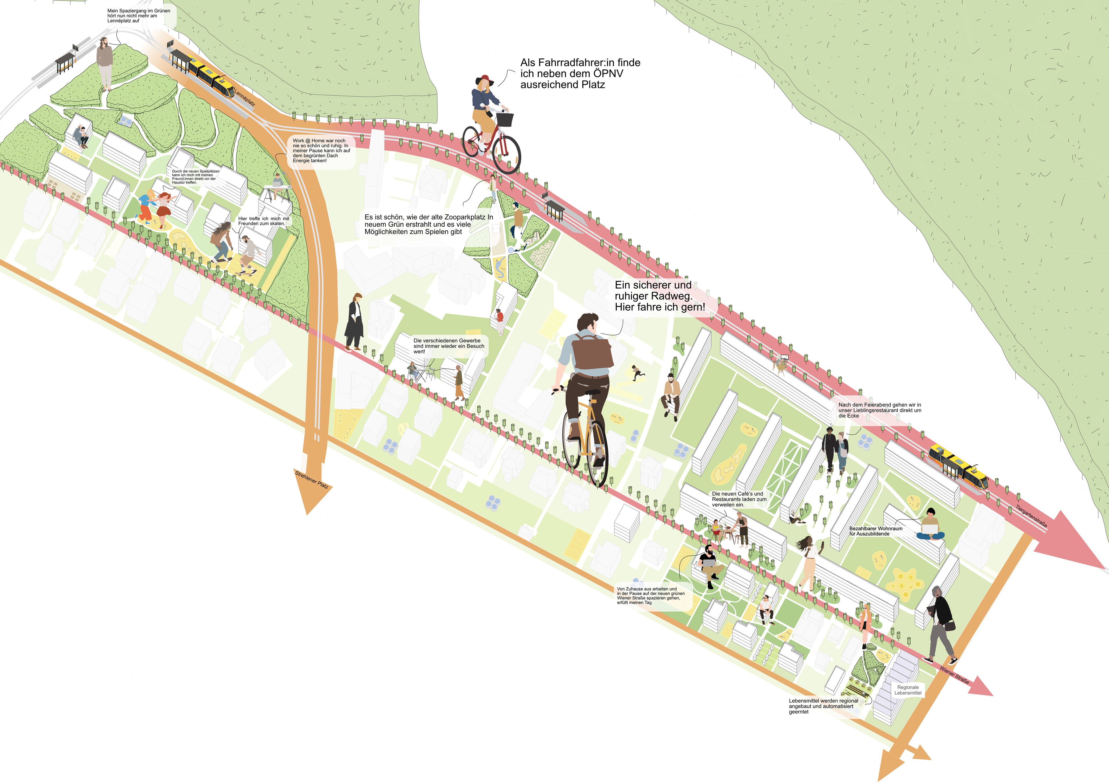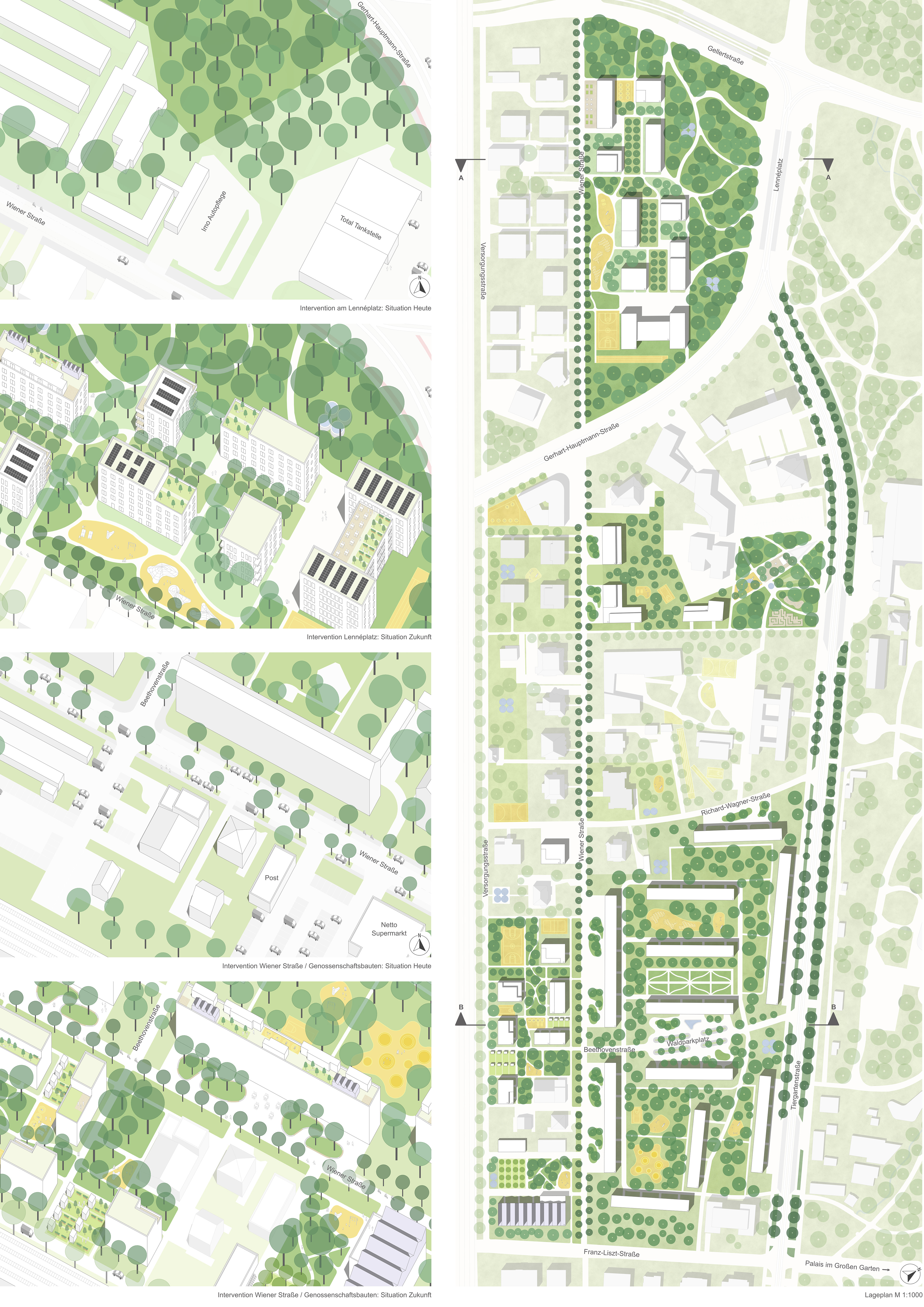 Im Bezug auf Freiflächen ist unsere Kernidee, dass sich die Grenzen zwischen Park und Stadt zukünftig vermischen. So soll sich der Grünraum in die umliegenden Gebiete ausweiten und die Lebensqualität durch ein besseres (Luft)Klima verbessert werden. Zusätzlich wurde darauf geachtet, den Wert an neu versiegelter Fläche so gering wie möglich zu halten, indem z.B. bereits versiegelte Flächen ein upcycling erfahren. Im Detail bedeutet dies, dass am Lennéplatz auf den Flächen der verfallenen Gebäude, aber auch der Tankstelle und Waschstraße, Neubauten entstehen. Selbiges gilt für Neubauten entlang der Wiener Straße. Der angrenzende Raum wird in Freizeitflächen für Outdoor Sportgeräte, Kletternetze etc. umgenutzt. Die Flachdächer wiederum werden mit Solarkollektoren, Nutz- und Zierpflanzen bestückt. Die Vegetation soll einen natürlichen Lärmschutz bieten und die bestehende Vegetation soll mit Wegen ausgestattet werden. Da von einem Rückgang von Autos im Stadtbild auszugehen ist, ist die Wiener Straße zukünftig z.B. Fahrradfahrer:innen und Fußgänger:innen vorbehalten. Einzig die Tiergartenstraße ist zusätzlich dem ÖPNV vorgesehen. Die bestehenden Genossenschaftsbauten werden vertikal um Dachkieze erweitert und grundlegend saniert. Auf der Fläche des heutigen Supermarktes entsteht ein selbstversorgender Supermarkt mit vertikalem Gewächshaus und zur privaten Nutzung sollen Kleingärten entstehen. Um die neu entstehenden Grünflächen bewässern zu können, wird es dezentrale Wasserauffangbecken geben.