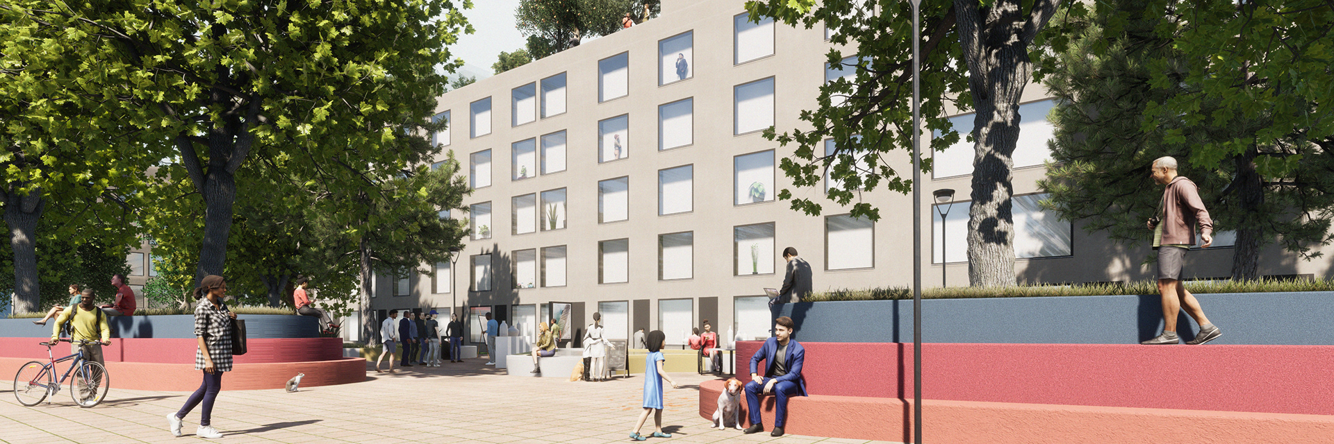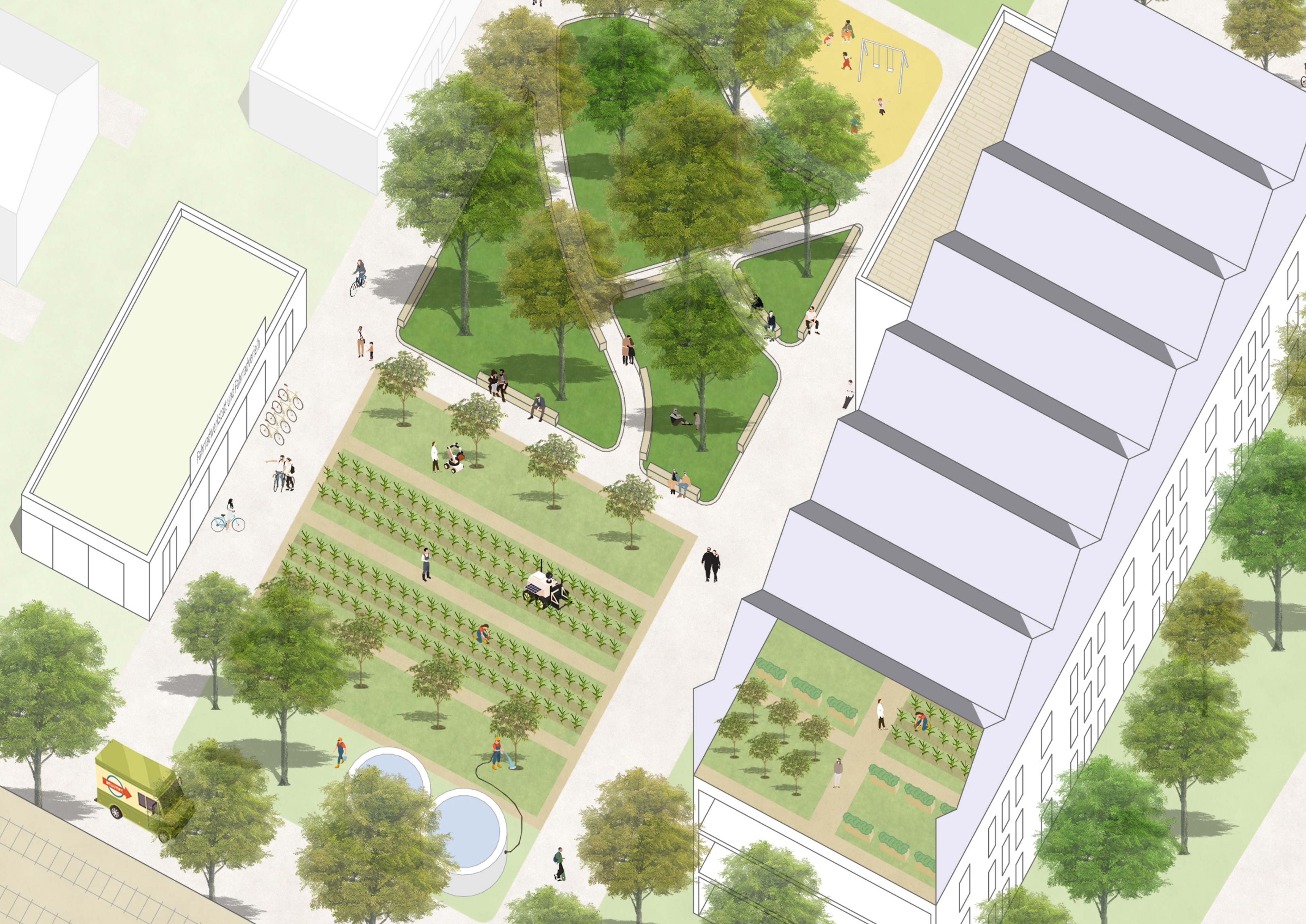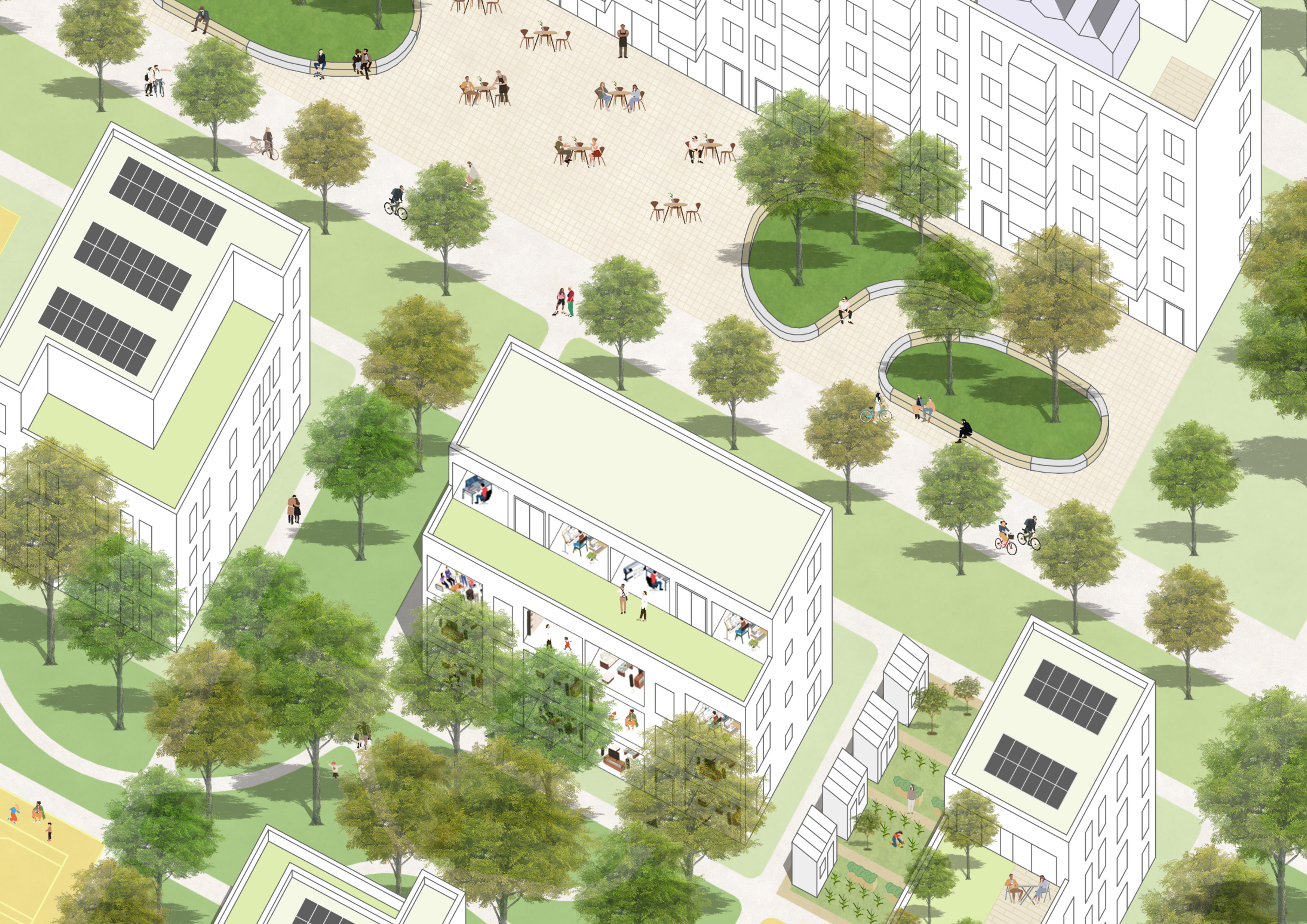Im Bezug auf Freiflächen ist unsere Kernidee, dass sich die Grenzen zwischen Park und Stadt zukünftig vermischen. So soll sich der Grünraum in die umliegenden Gebiete ausweiten und die Lebensqualität durch ein besseres (Luft)Klima verbessert werden. Zusätzlich wurde darauf geachtet, den Wert an neu versiegelter Fläche so gering wie möglich zu halten, indem z.B. bereits versiegelte Flächen ein upcycling erfahren. Im Detail bedeutet dies, dass am Lennéplatz auf den Flächen der verfallenen Gebäude, aber auch der Tankstelle und Waschstraße, Neubauten entstehen. Selbiges gilt für Neubauten entlang der Wiener Straße. Der angrenzende Raum wird in Freizeitflächen für Outdoor Sportgeräte, Kletternetze etc. umgenutzt. Die Flachdächer wiederum werden mit Solarkollektoren, Nutz- und Zierpflanzen bestückt. Die Vegetation soll einen natürlichen Lärmschutz bieten und die bestehende Vegetation soll mit Wegen ausgestattet werden. Da von einem Rückgang von Autos im Stadtbild auszugehen ist, ist die Wiener Straße zukünftig z.B. Fahrradfahrer:innen und Fußgänger:innen vorbehalten. Einzig die Tiergartenstraße ist zusätzlich dem ÖPNV vorgesehen. Die bestehenden Genossenschaftsbauten werden vertikal um Dachkieze erweitert und grundlegend saniert. Auf der Fläche des heutigen Supermarktes entsteht ein selbstversorgender Supermarkt mit vertikalem Gewächshaus und zur privaten Nutzung sollen Kleingärten entstehen. Um die neu entstehenden Grünflächen bewässern zu können, wird es dezentrale Wasserauffangbecken geben.