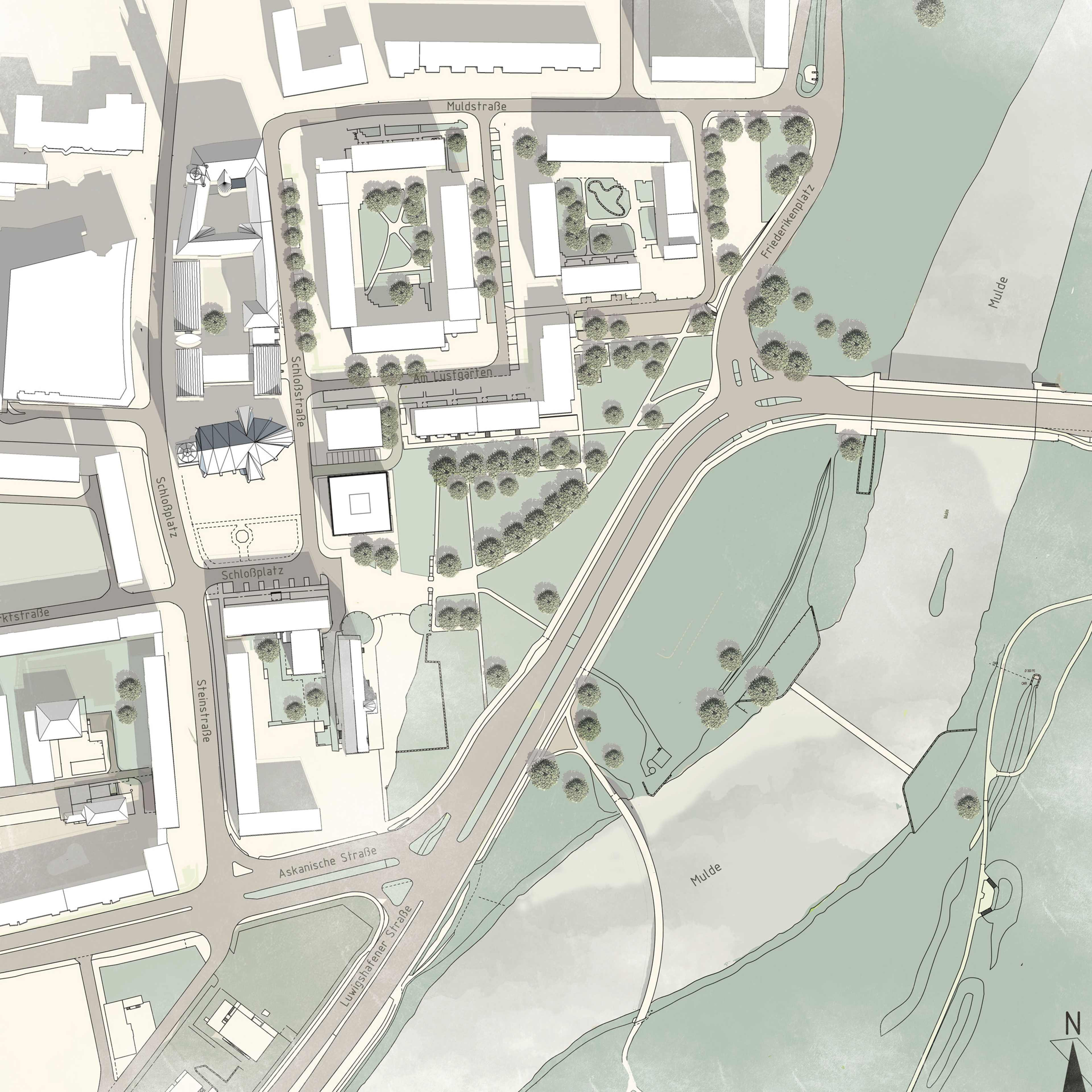 entfalten sich stadträumliche Beziehungen und Spannungsfelder. Das entworfene