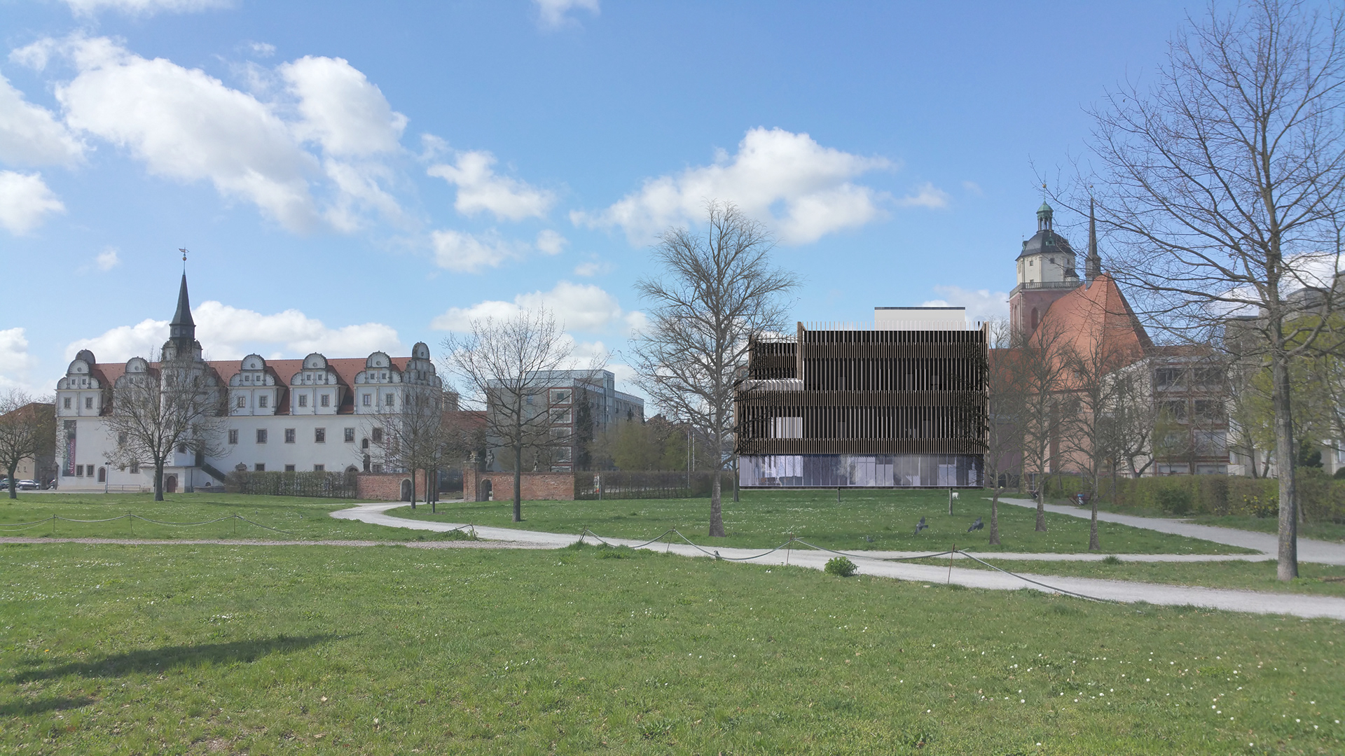 flankiert von dem signifikanten Bau der Marienkirche, im Süden der verstellte Schlossflügel